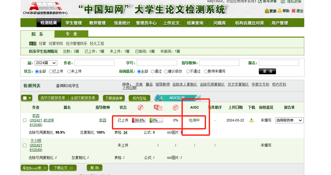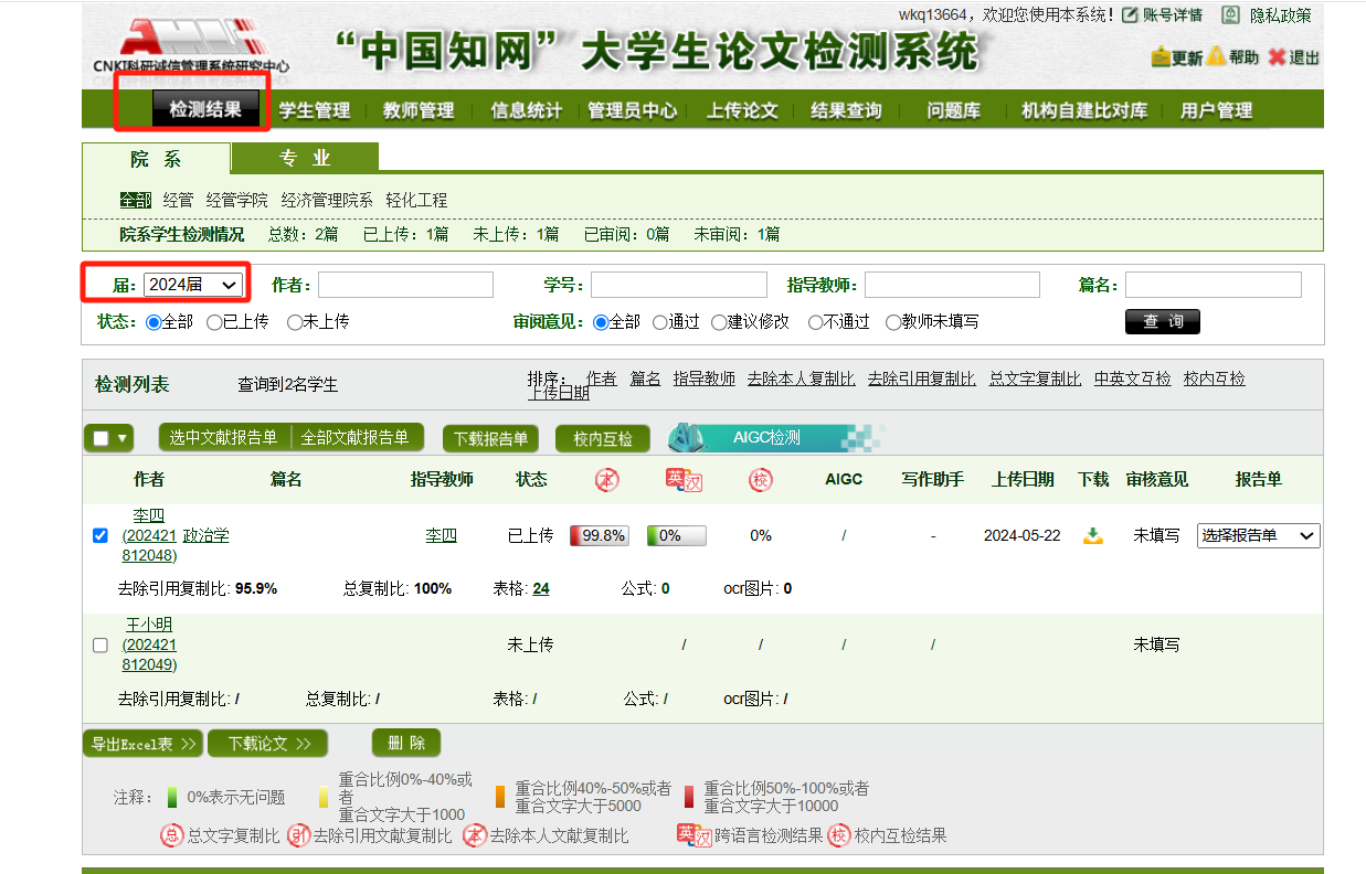 1、学院管理员老师登录pmlc系统,点击检测结果,此处可以筛选各种条件,对学生已经提交且通过查重的论文点击检测AIGC检测。