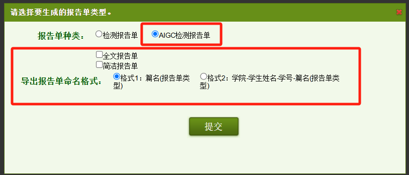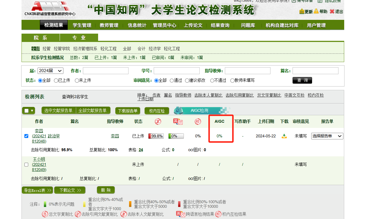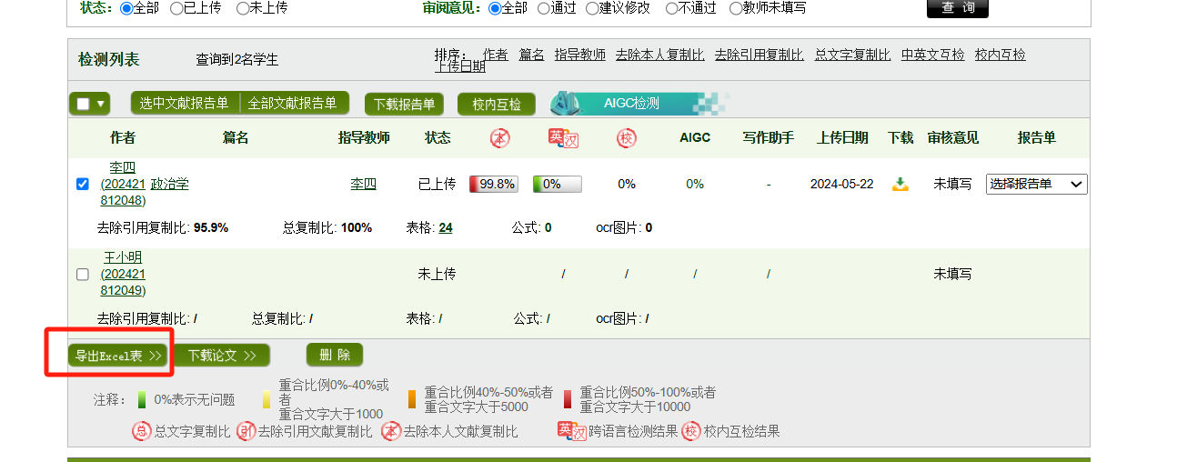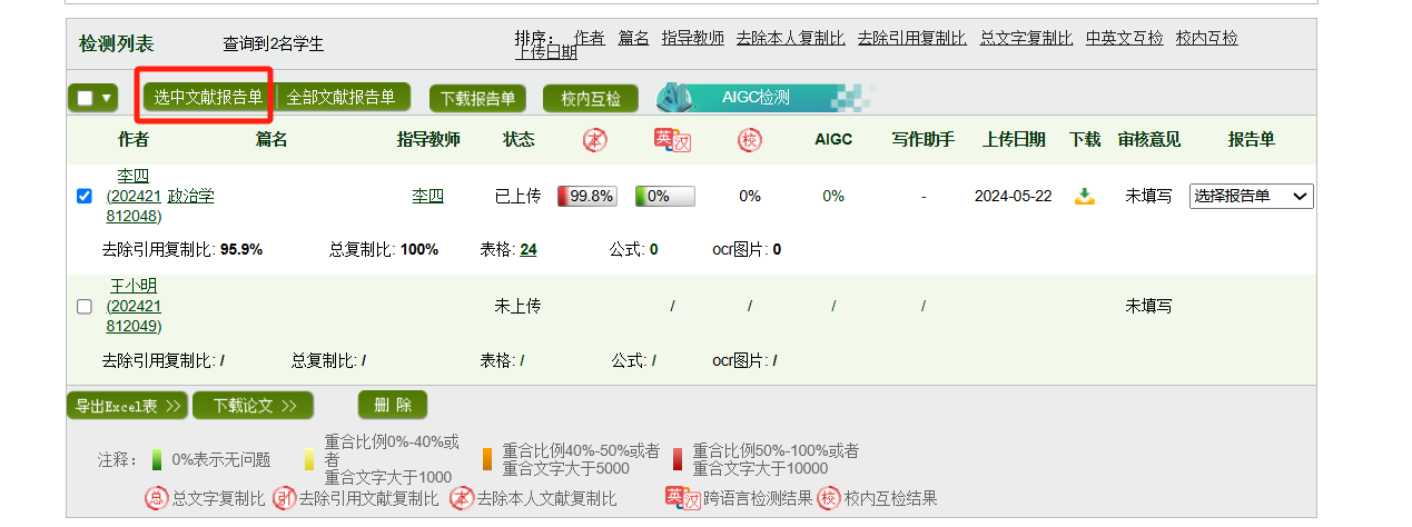 此处对应抽检名单选择后点击选中检测,即可对此学生论文进行AIGC检测。
