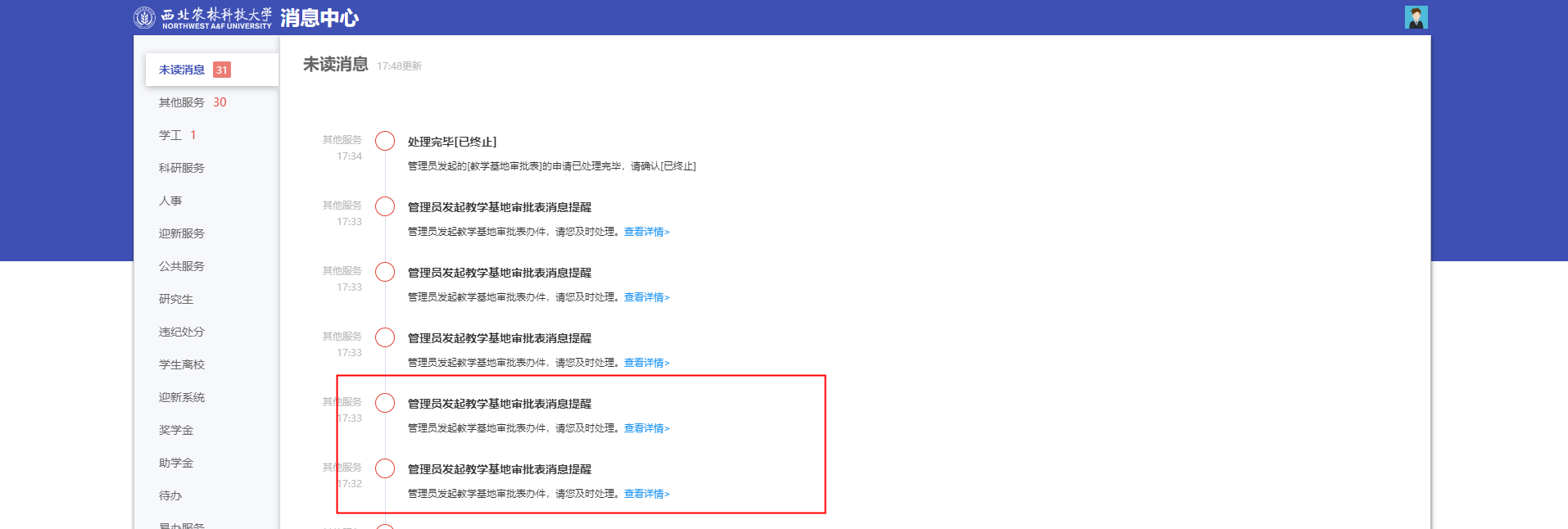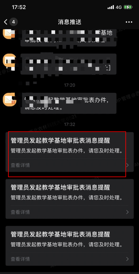 学校企业微信消息中心也会收到相应消息
