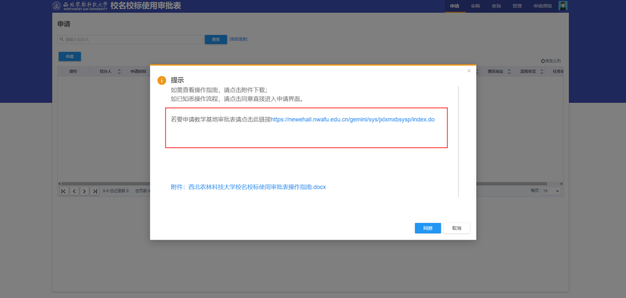 点击申请弹出对话,根据提示若要申请教学基地审批表,点击蓝色链接跳转进入申请界面;