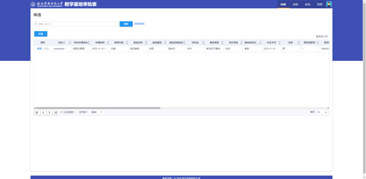 教学基地审批表申请界面如下图,点击申请按钮