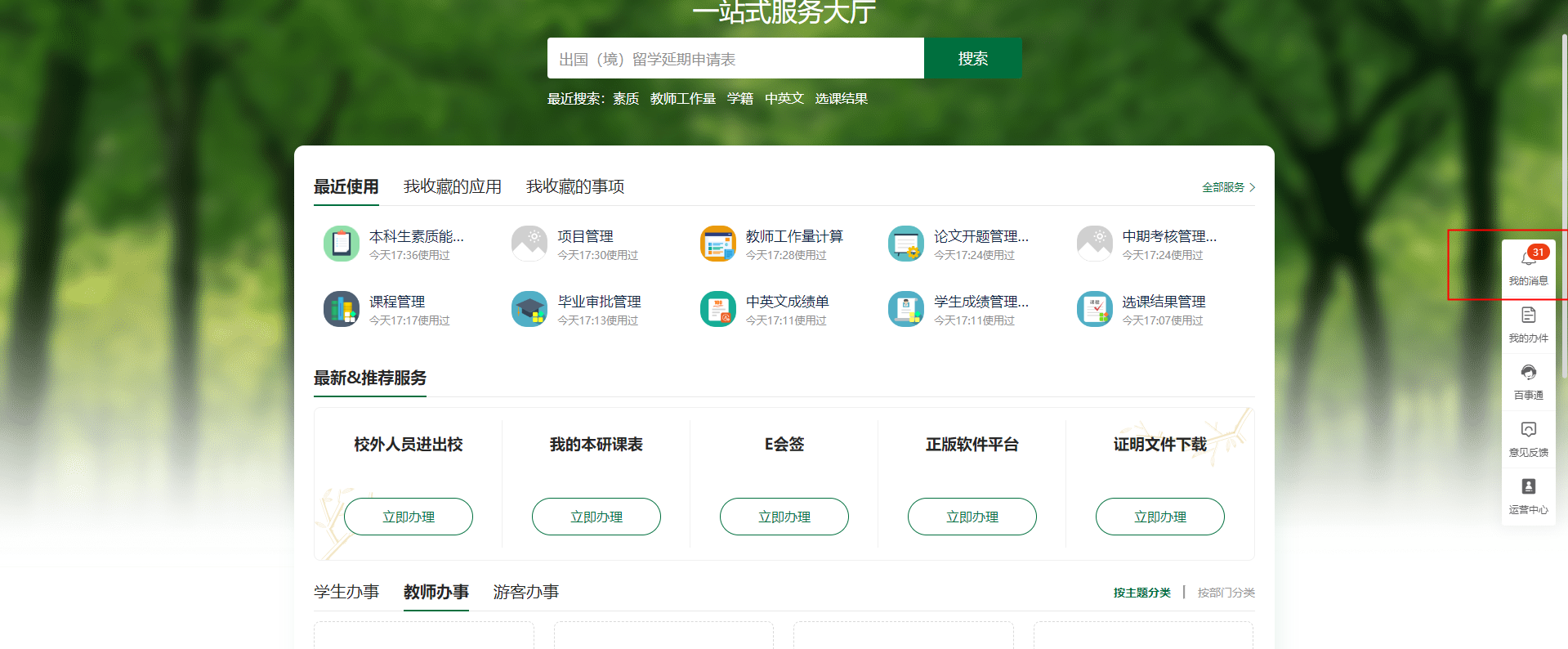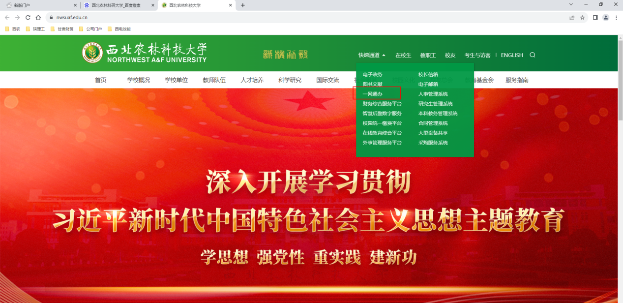1.PC端浏览器访问学校官网,点击快速通道,进入学校“一网通办”平台