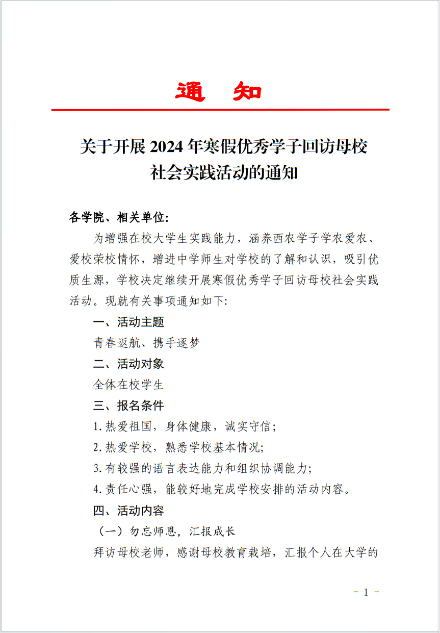 首页» 通知公告» 关于开展 2024 年寒假优秀学子回访母校社会实践活动的通知