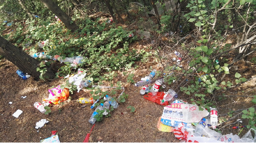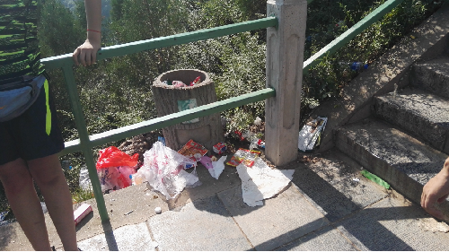 队员们一路爬去,发现了骊山环境问题的严重性。首先,山路的两侧只有寥寥无几的垃圾桶,设置相当不合理。没有规定统一的垃圾堆放点,使得不少游客的垃圾都是随手乱扔的。其次,在山区工作的环卫工人也没有切实负起责任,对自己管辖的区域的垃圾不能及时清理,导致垃圾越堆越多。