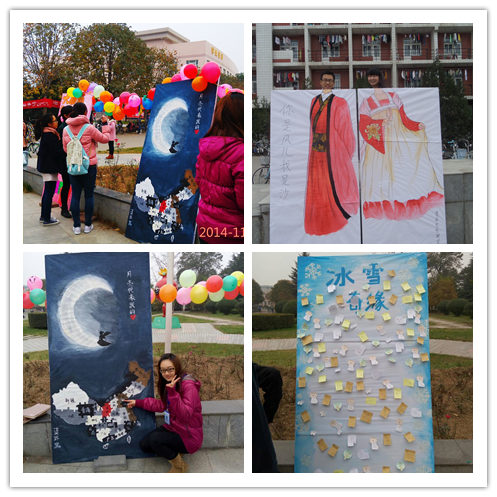 活动分为五个板块:冰雪奇缘留言板、月亮代表我的心、大富翁之桃花朵朵开、你是风儿我是沙和飞鸽传情。活动刚开始便吸引了众多路过的同学积极参加游戏。闺蜜、情侣参加“你是风儿我是沙”板块,在唯美的宣传板合影纪念他们的友情、爱情。而异地恋的情侣们则参加了“月亮代表我的心”的板块,以此来表达对远方恋人的爱与思念。单身同学则选择参加了交友板块——“桃花朵朵开”和“冰雪奇缘”,在其中收获快乐。众多同学也通过写明信片的方式来向远方的朋友、家人等表达思念之情。