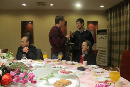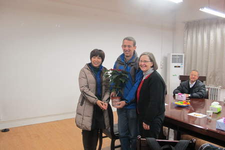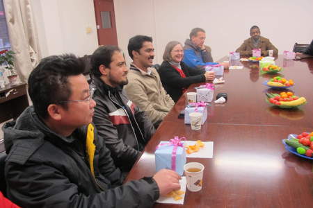 田霄鸿副院长首先代表学院对外籍教师Jeff和夫人以及全体留学生致以节日的祝福,并总结了我院过去几年留学生教育方面取得的成果,并向Jeff夫妇和各位留学生导师的辛勤工作和尽心付出表示感谢。我校研究生院培养处王玉环副处长将精心准备的节日礼品和鲜花亲手送给Jeff夫妇。王宏武书记和吕家珑院长向各位留学生和留学生导师送上了学院的新年礼物。座谈会上,各位领导、留学生导师和Jeff先生、Jeff夫人及留学生进行了亲切的交谈,就留学生培养、管理和生活等问题充分交换了意见。与会人员纷纷表示将更加努力做好留学生教学管理和指导工作,为学院和学校加强国际交流作出贡献。
