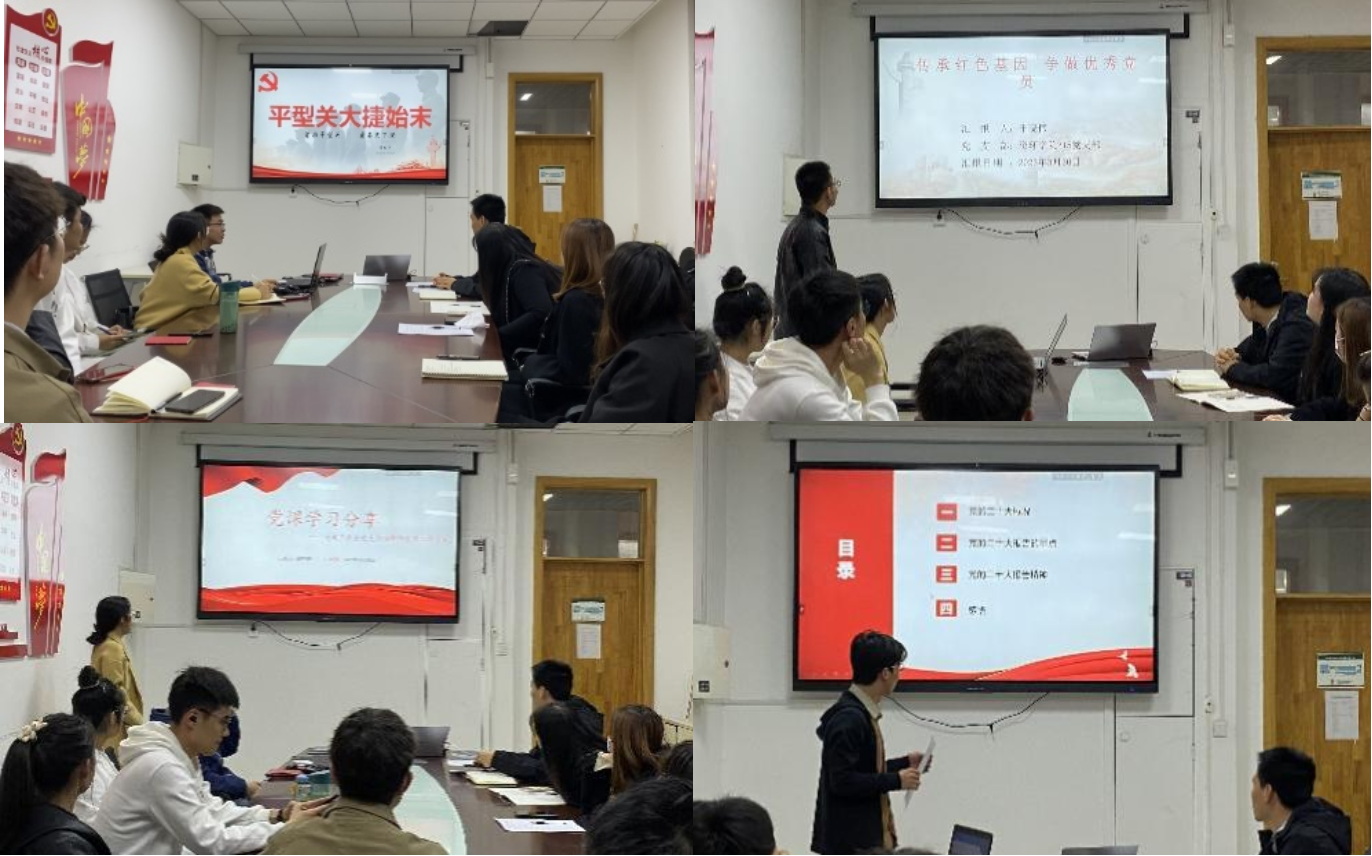 会议开始,纪检委员毛江平带领全体党员从党的二十大概况、意义及党的二十大精神等方面学习了党的二十大。预备党员郑宇桐分享学习《关于在全党大兴调查研究的工作方案》,号召大家在搞好科研的同时更应该积极参加实践调研活动,学以致用,努力成为“一懂两爱”的人才,担负起强农兴农的使命。预备党员于晓伟带领大家学习伟大建党精神、长征精神、抗美援朝精神,他表示伟大建党精神凝结成32个字,字字铿锵,是中国共产党人初心使命的真实呈现;长征中红军战士们坚定信念、不畏艰难,抗美援朝中中华民族不畏强暴、敢于斗争的精神激励我们永远奋斗。宣传委员李盼弟从南泥湾、杨家岭、枣园、梁家河讲述黄土高原上的红色记忆,学习“全心全意为人民服务”、“自力更生、艰苦奋斗”、“开拓创新”的延安精神。组织委员李向宇运用自己的GIS知识,形象的讲述了平型关大捷,让大家直观了解山地战中占据地理位置的重要性。