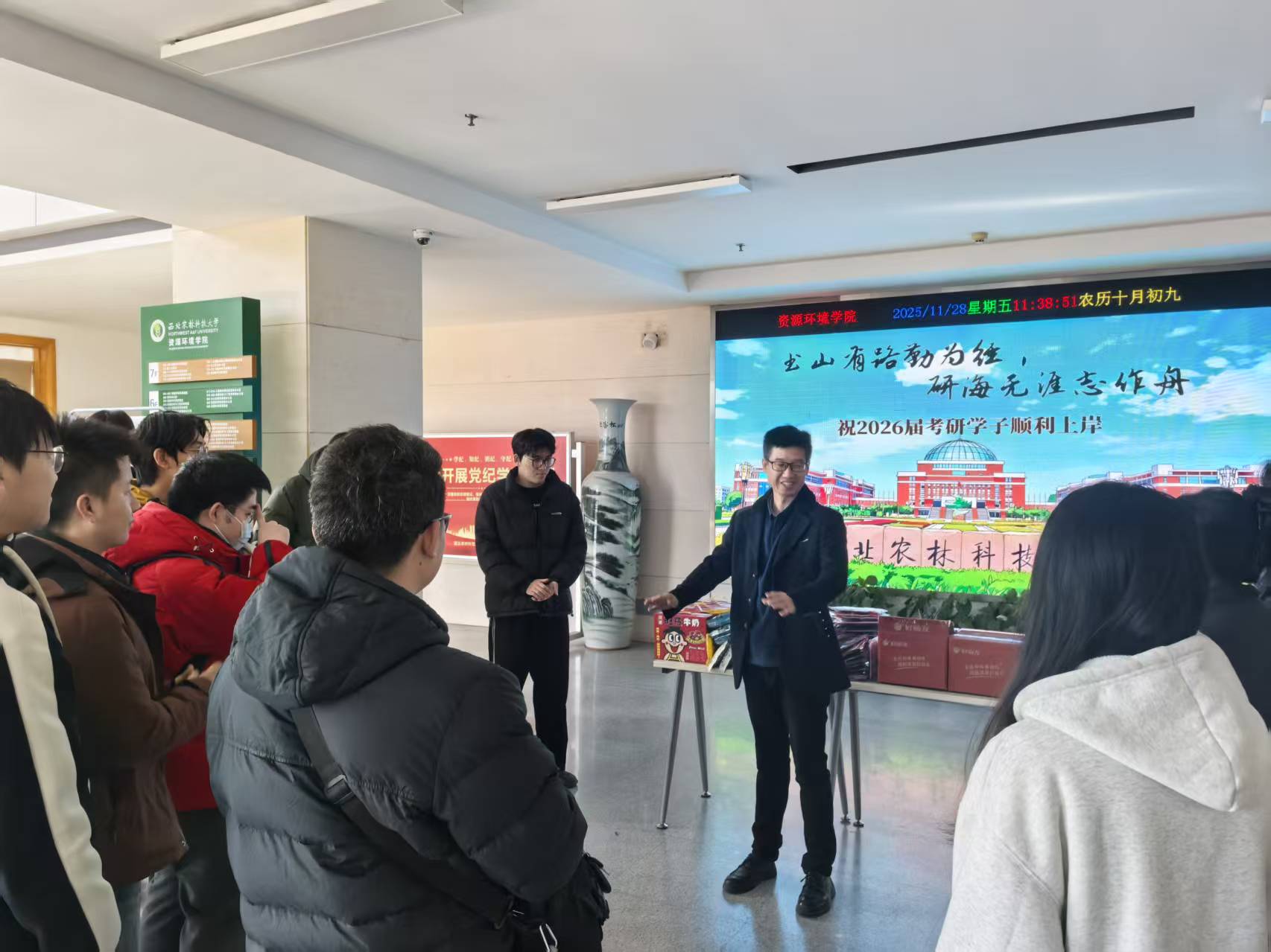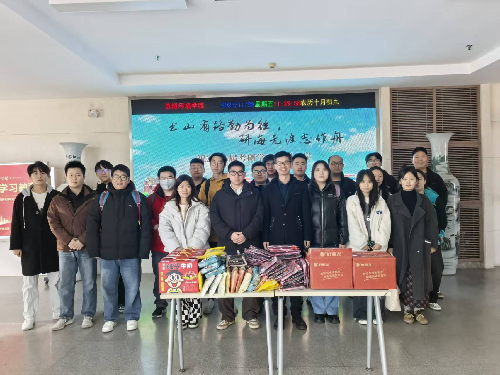 寒意渐浓,温暖随行。在2026年全国硕士研究生招生考试即将来临之际,为鼓舞备考学子、坚定考研信心,11月28日,学院在资环楼二楼大厅开展考研慰问活动。